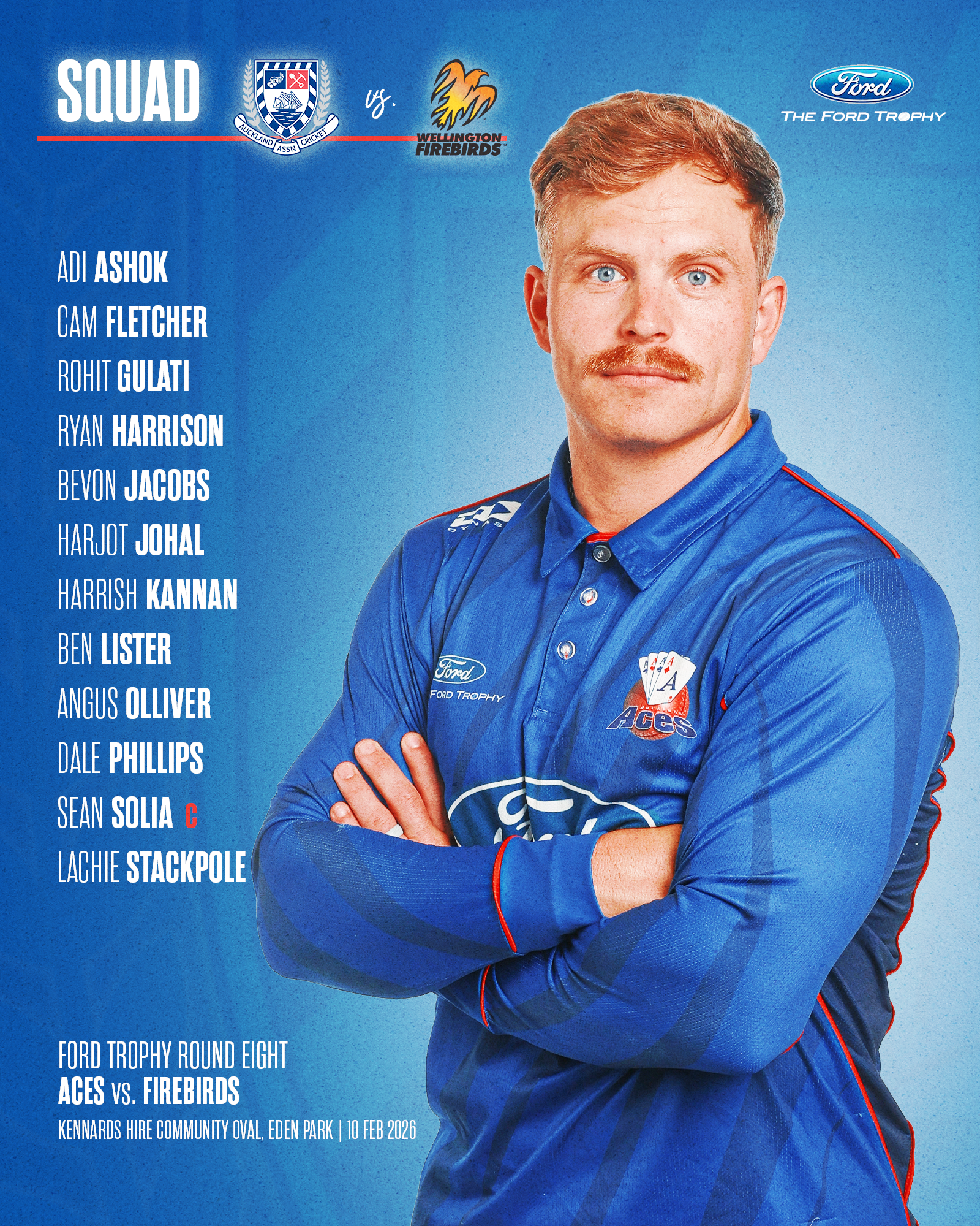 The Auckland ACES take on the Wellington Firebirds in Round 8 of the Ford Trophy at Eden Park’s Kennards Hire Community Oval, with the first ball at 10.30am on Tuesday 10 February.