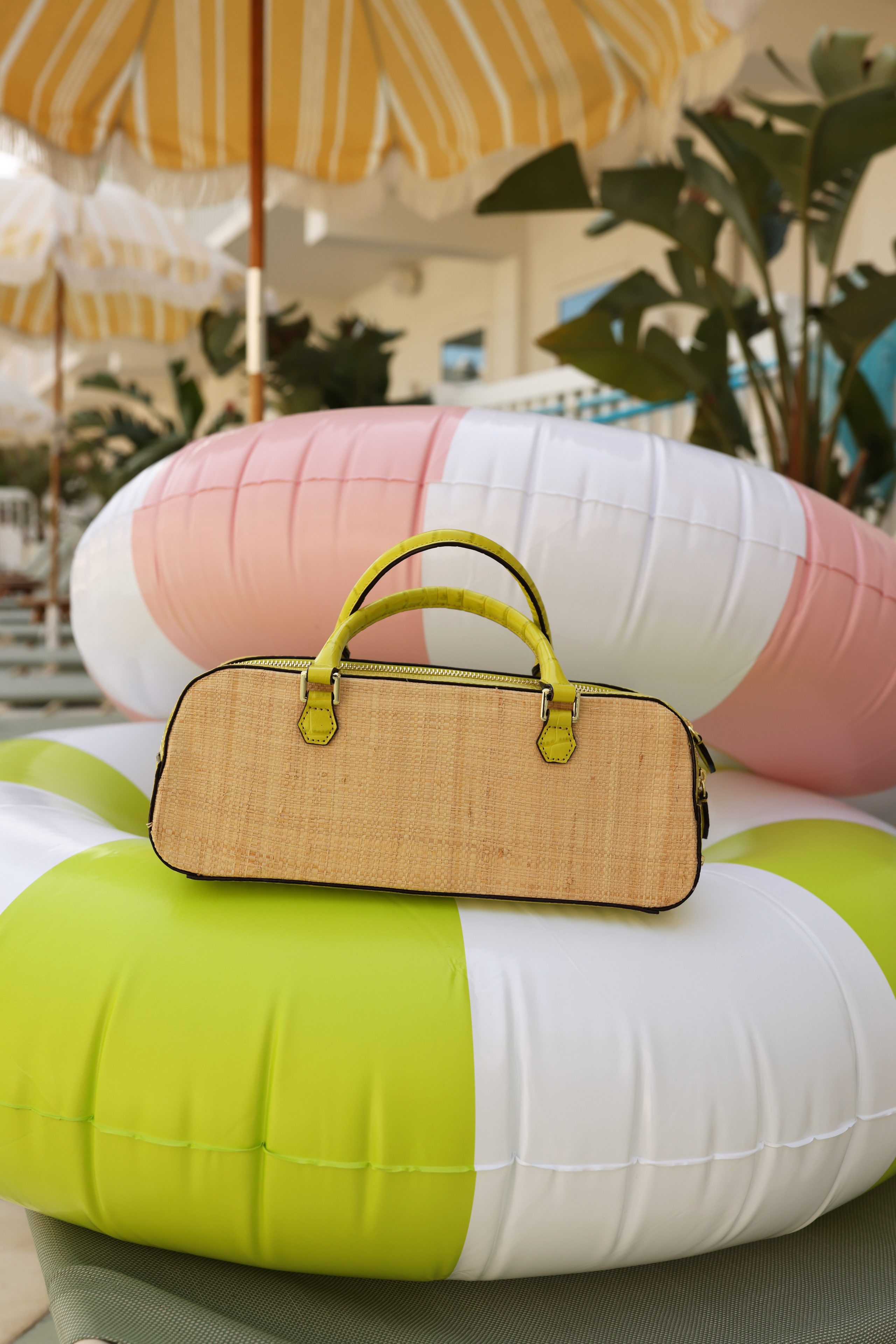 The EW top handle features a beautiful raffia inset that makes it feel summer-ready, with the prettiest pop of chartreuse added for added color. While I usually carry one with me as a top handle, it also includes a crossbody strap for those days when you’re on the go!