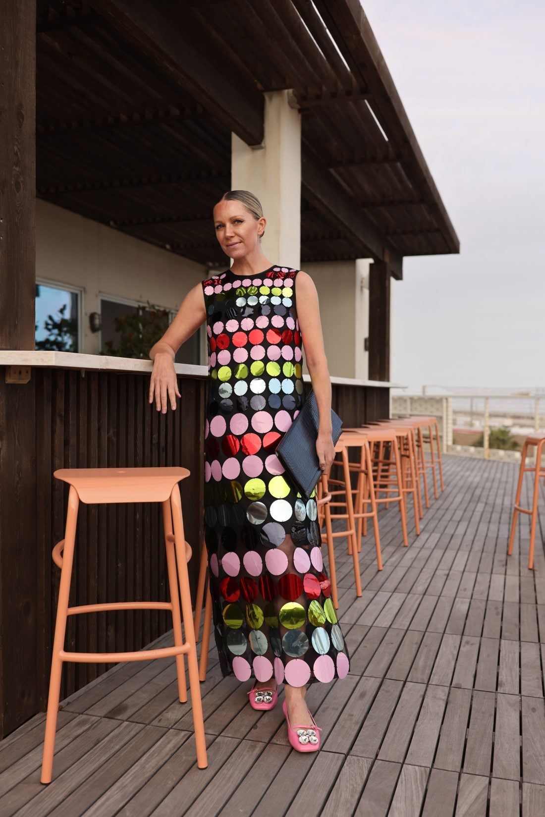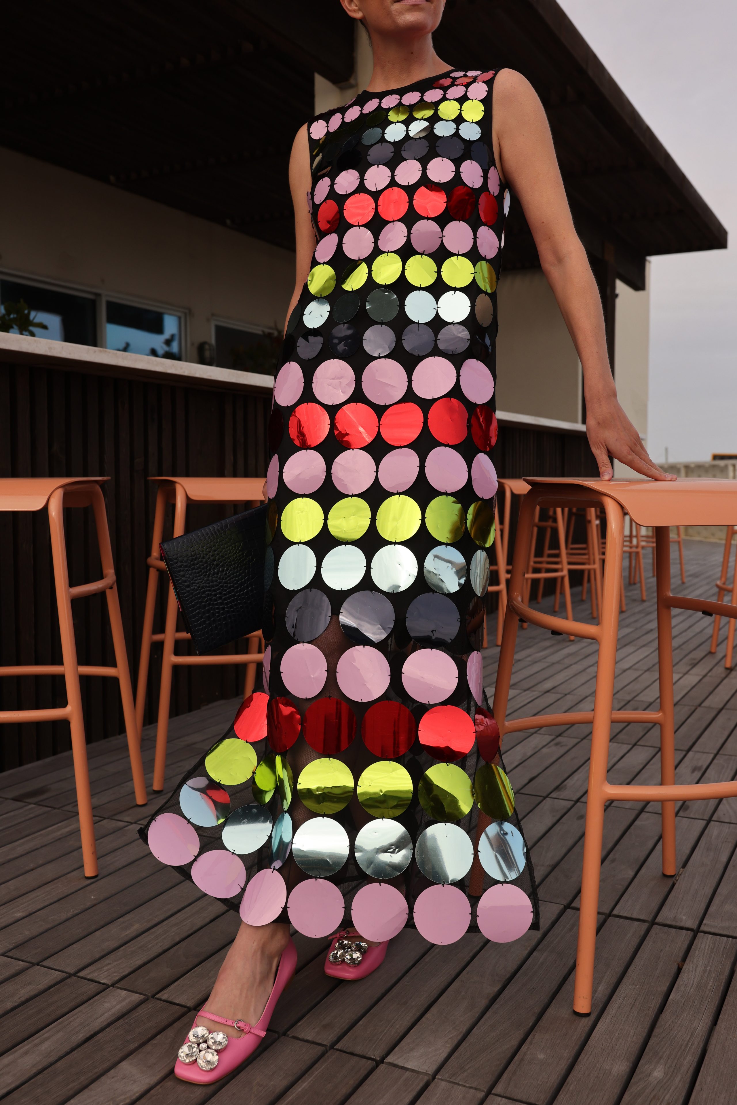 And now we’ve come to the showstopper of the collection – this navy mesh maxi dress adorned with large circular paillette sequins, is nothing short of spectacular. And because it’s the main character, it doesn’t need any supporting equipment. I’d simply style it with metallic mules, a statement stud earring, and an oversized navy clutch from the collection.